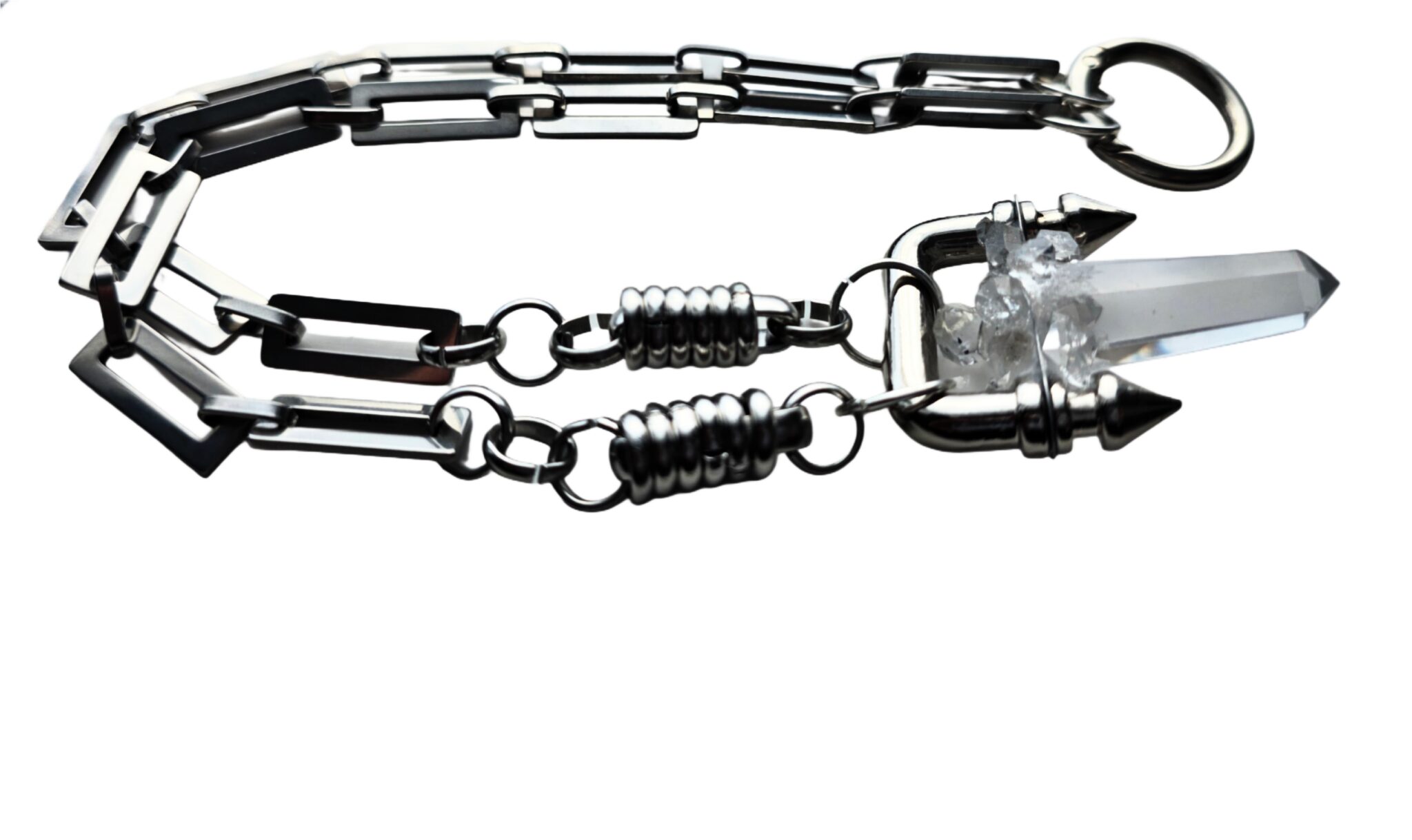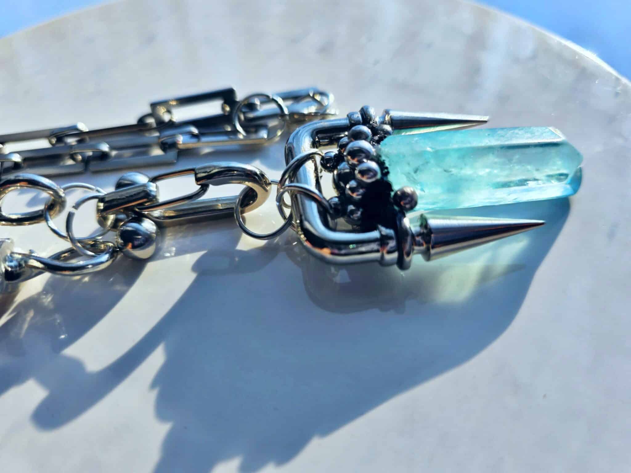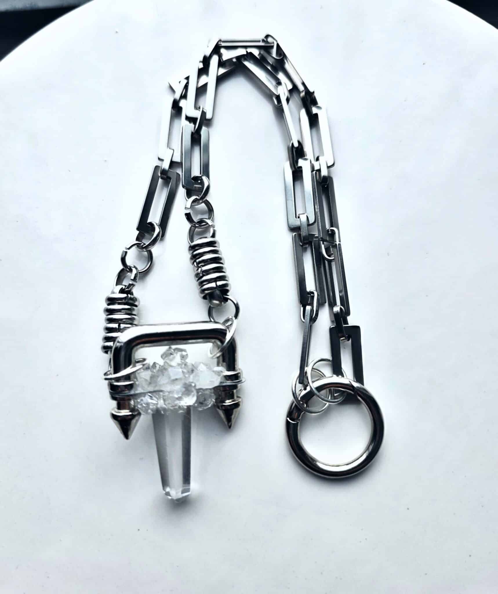 Built from industrial metal hardware and sculptural crystals, these necklaces function as wearable objects rather than traditional jewelry.
