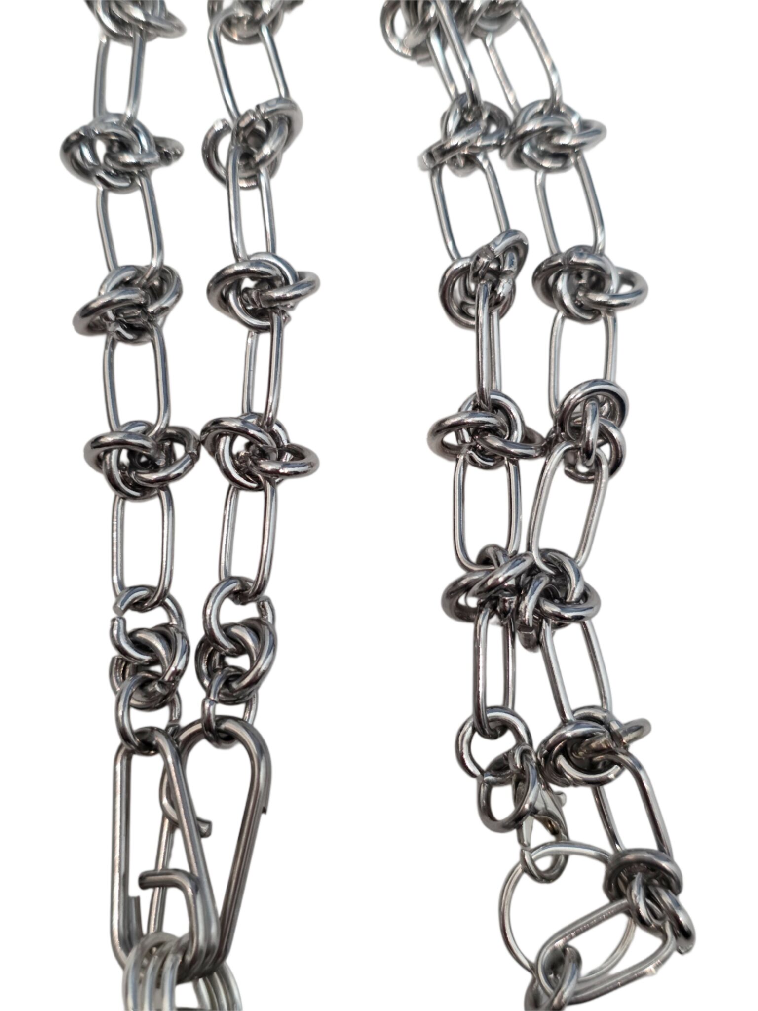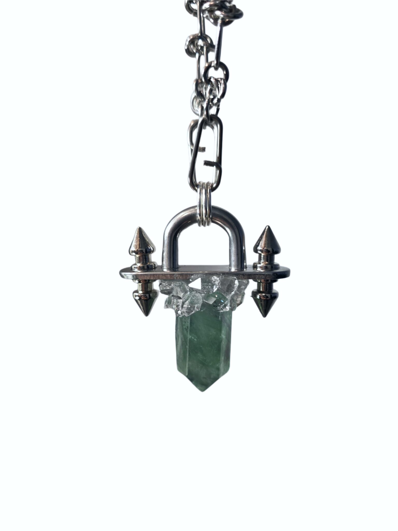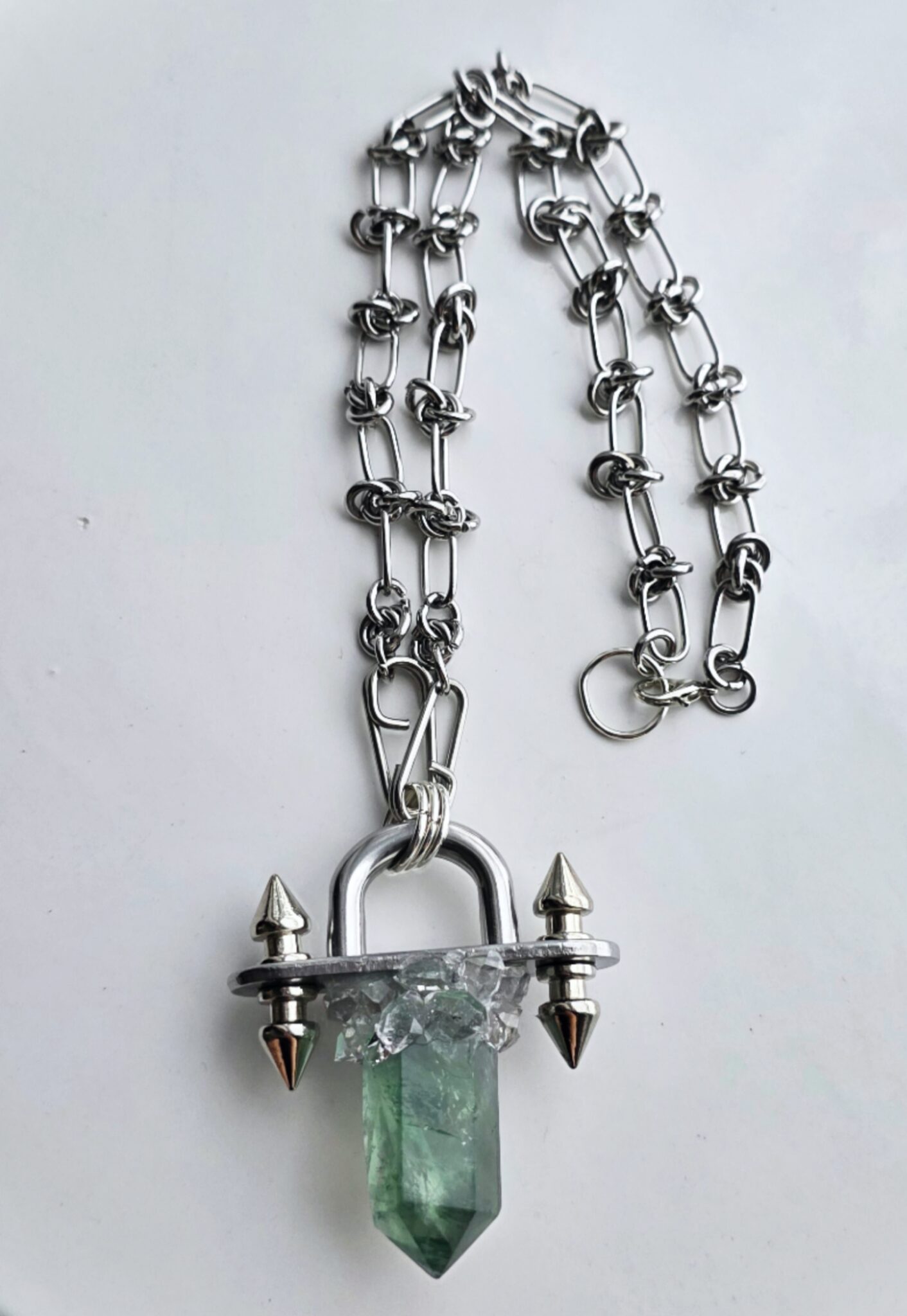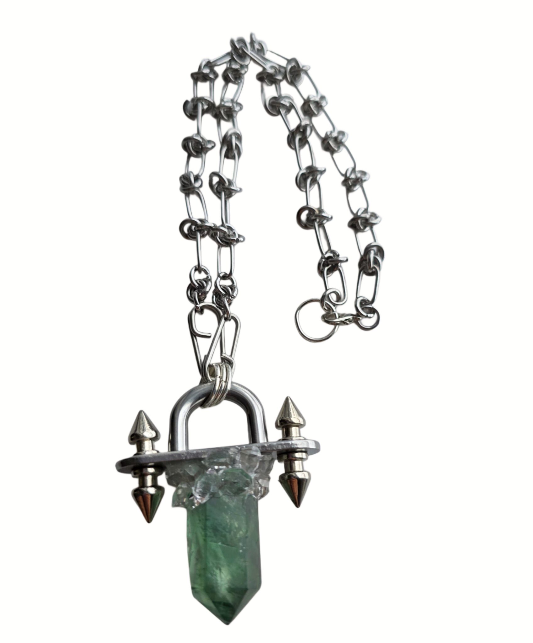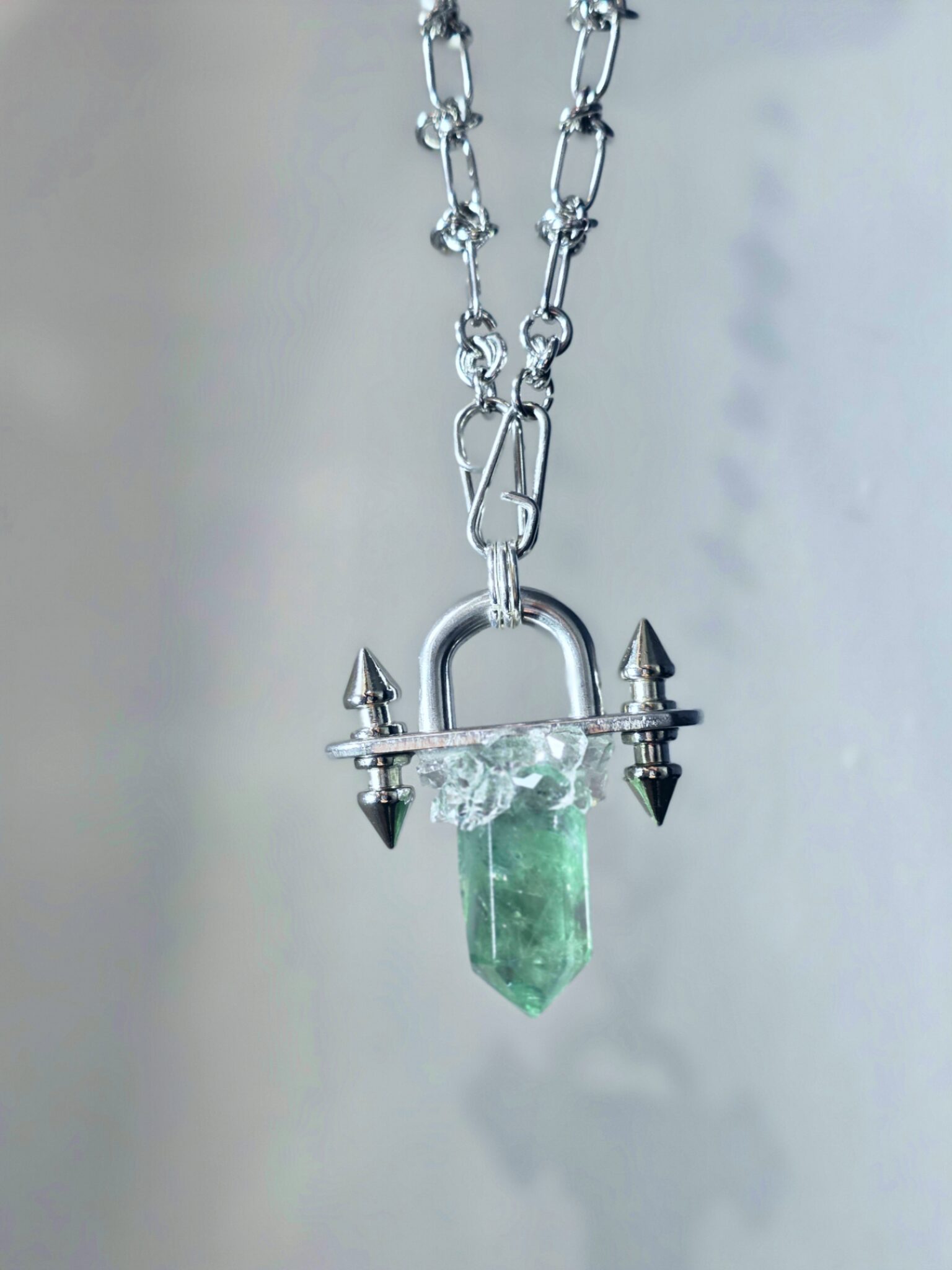 Built from industrial metal hardware and sculptural crystals, these necklaces function as wearable objects rather than traditional jewelry.